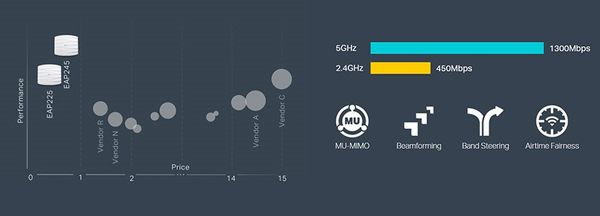 EAP245 sử dụng chipset cấp doanh nghiệp QCA, bộ khuếch đại công suất chuyên dụng, và ăng-ten chuyên nghiệp để mang đến hiệu năng vượt trội. Sản phẩm này còn hỗ trợ công nghệ 802.11ac Wave 2 MU-MIMO thế hệ mới nhất, đảm bảo tốc độ Wi-Fi 1750 Mbps và phủ sóng mạnh trên cả băng tần 2.4 GHz và 5 GHz.