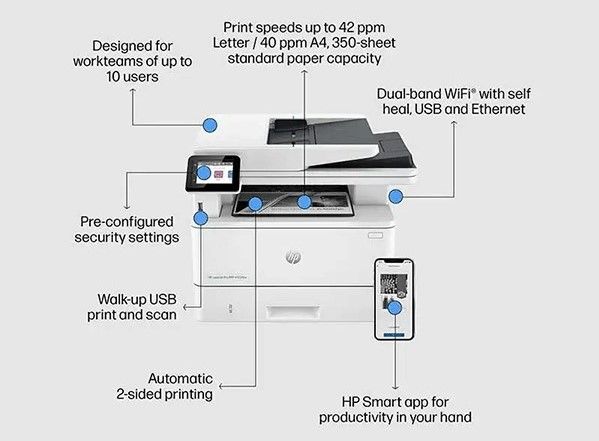 Ứng dụng HP Smart hỗ trợ đầy đủ trên Windows, macOS, iOS và Android, cho phép in, quét và quản lý máy từ xa. Cổng USB 2.0 và Ethernet Gigabit đảm bảo kết nối ổn định cho môi trường mạng doanh nghiệp.