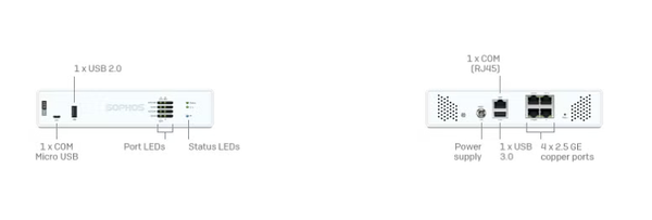 Thiết bị tường lửa Sophos XGS 88 với thiết kế dạng để bàn nhỏ gon, kết nối 4 cổng đồng 2.5 GE tốc độ cao, 2 cổng quản lý (1 x COM RJ45 + 1 x Micro-USB) chuyên dụng và 2 cổng USB giúp linh hoạt cho việc quản trị - bảo trì thiết bị. Kết hợp với các công nghệ tiên tiến hàng đầu của Sophos khác như: